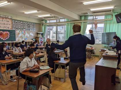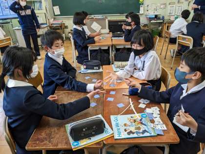 ラッキーカードゲームで、中学校で入りたい部活動を伝える練習をしました。