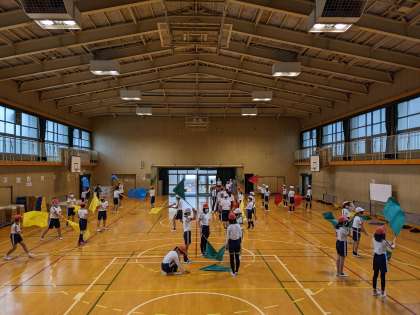 昨日、今日と体育で、集団演技のフラッグ練習をしています。気持ちを一つに、改良に改良を重ねてよりレベルアップしています。