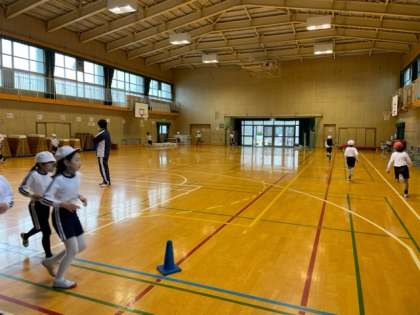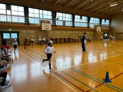今日は、体育館を5分間で何分間走ることができるかテストをしました。