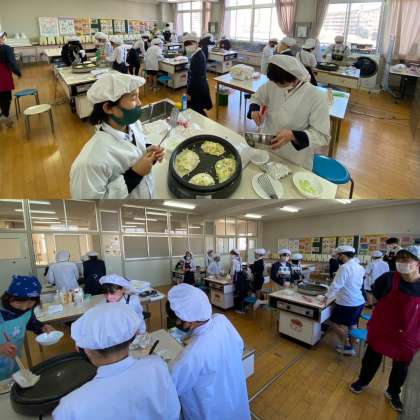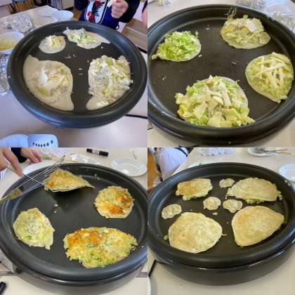 自分が切った具材を使って上手に焼くことができています。