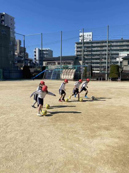 サッカーの練習を行っています。ゴールに見立てたハードルを通過したら2点などチームで楽しく練習しています。