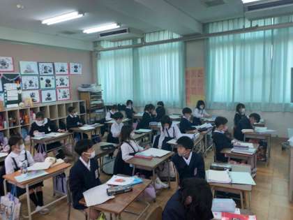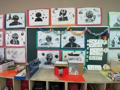 教室の後方に紙版画が掲示されています。作品をじっくり鑑賞すると、それぞれ表情が豊かに表現されていて楽しかったです。