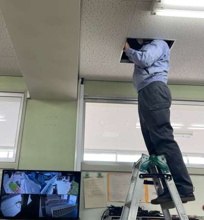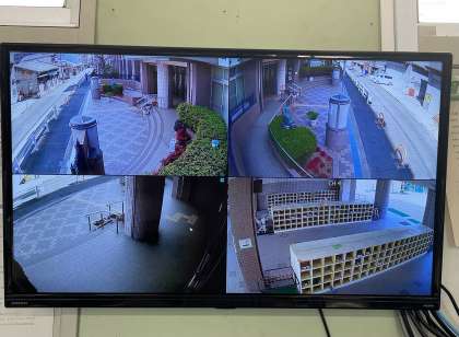 本校では防犯監視システムを導入しています。外部からの来訪者確認や児童等の安心感の醸成、犯罪企画者の侵入防止や犯意の抑制を目的としています。今までは職員室でモニタリングしていましたが、校長室でも行えるよう工事をしました。