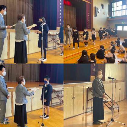 今日は席書会の表彰式でした。3〜6年生で金賞、銀賞、はぐくみ賞の児童が順番に前に出て、はぐくみコーディネーターの香川さんより賞状を授与されました。