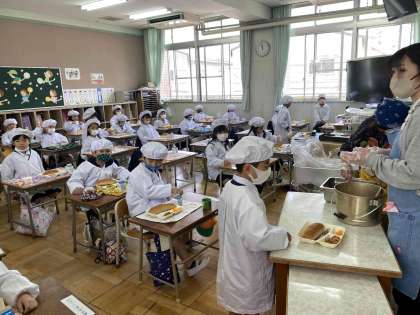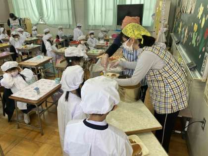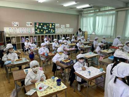 給食が始まって今日で3日が経ちます。1年生はどちらの学級も教えてもらったことを慎重に実践して上手に準備ができています。