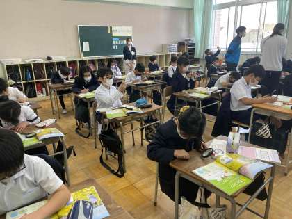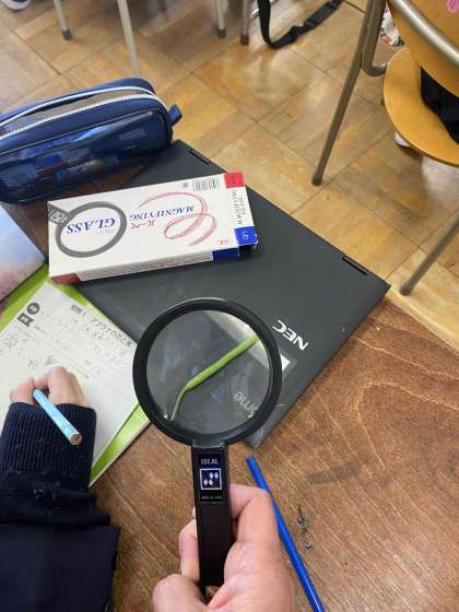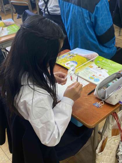 アブラナの花のつくりを学習しています。虫メガネを使って花や実をじっくりと観察し、気がついたことを書いています。新たな発見があると「校長センセ〜見てください」といって大発見を教えてくれる素敵な5年生です。
