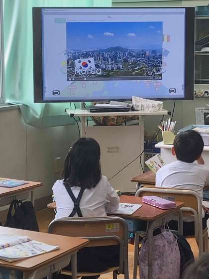 いろいろな国のあいさつを勉強しました。ナマステやオラなど、初めて知る国のあいさつでは、「へえ〜凄い」と言っていました。今日は、大型テレビに動画を映しながらの学習だったので、オーストラリアでは、オペラハウスやエアーズロックが映ると「素敵な景色!」と興味は広がるばかりです。