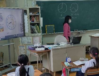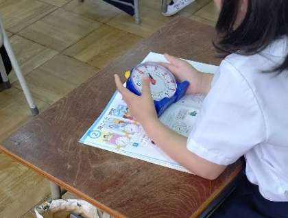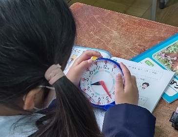 算数セットの時計を操作しながら2年生が、時間と時刻の勉強を手伝していましたあ