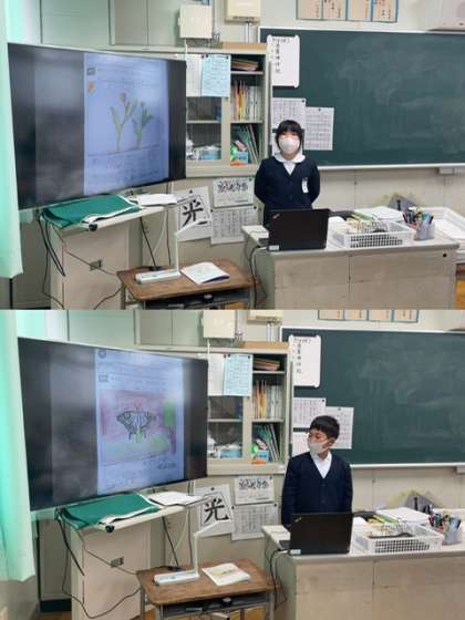 校庭で見つけた春の生き物を観察したカードに書き、1人ずつ前で発表しました。
