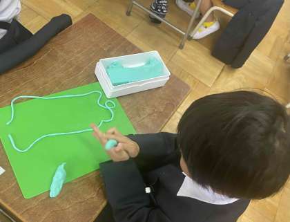 今日は粘土でどこまで細長〜く伸ばせるか大会がありました。校長先生が細長くつくると、その記録を越えようとみんな頑張って挑戦していました。