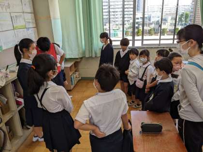 6年生の班長を中心に たてわり班で自己紹介ゲームをしました。 初めての1年生は