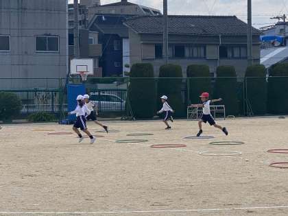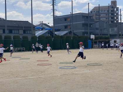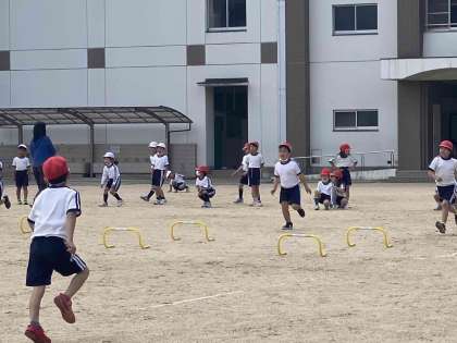フープを使ったりミニハードルを使ったりしながらいろいろな走り方の学習を行いました。