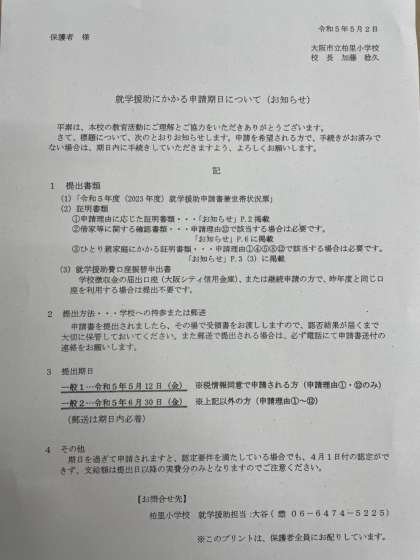 本日、就学援助にかかる申請期日について(お知らせ)を配付しました。