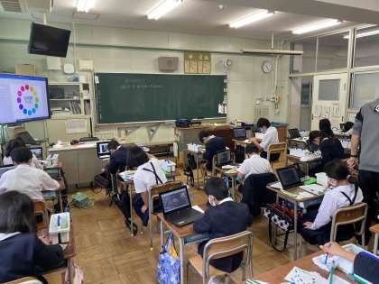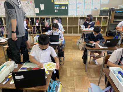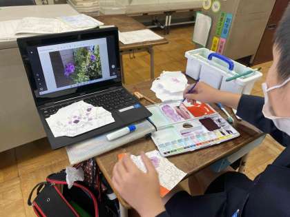 一人一台端末を使って校内で撮影した写真をもとに色づけを行いました。細部まで筆を器用につかって慎重に塗りを進めました。