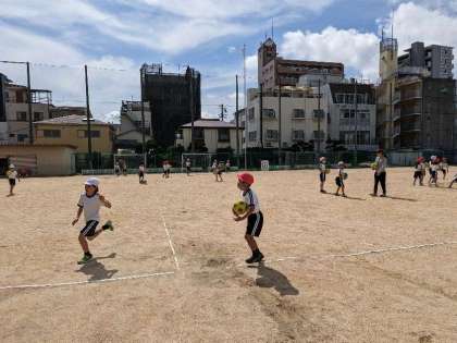 ボール遊び、工夫していろんな動きを楽しんでいます。ボールをバウンドさせ、股の下をくぐらせる、「あんたがたどこさ」をしている子もいました。