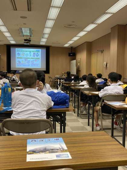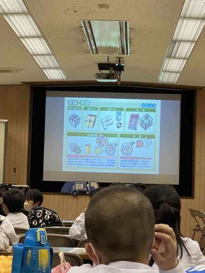 スライドを使って、recycle、reuse、reduceの3Rについて学習しています。もうすぐ工場での見学が始まります。