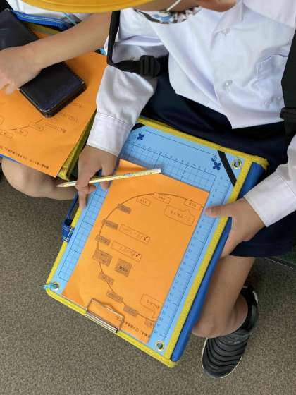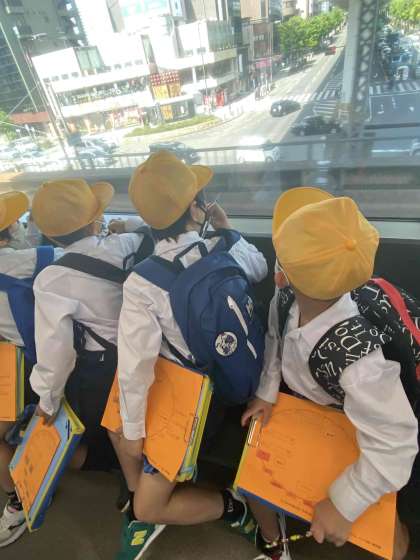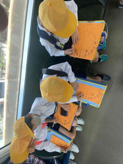 環状線が空いていたので、座ってワークシートに記入したり外の様子を観察したりしました。また、駅ごとに違う発車メロディも注意深く聞いていました。