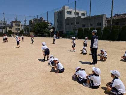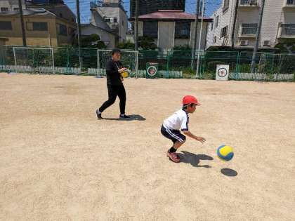 ボールを使って運動しています。リレー形式で友達を応援しています。ボールを上に投げてキャッチ。バウンドさせてキャッチ。いろんな動きを練習しています。