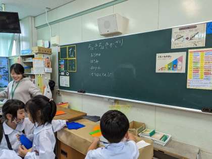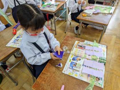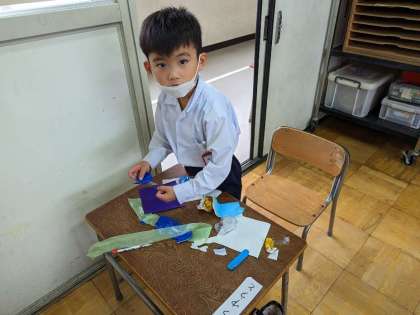 はさみとセロハンテープ使って工作していました。安全に気をつけて使うことができています。おりがみがいろんな形に変身していました。
