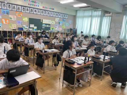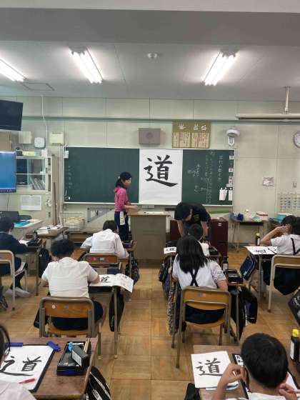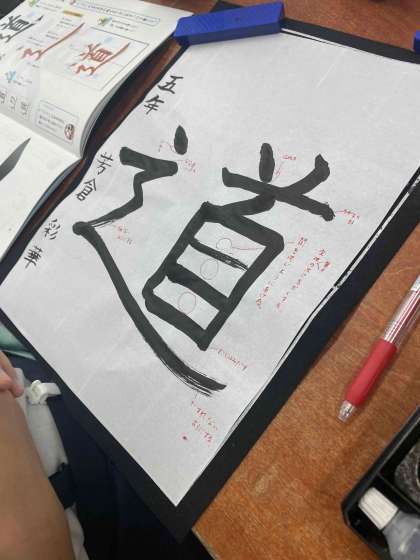 今日は「道」を書きました。準備や姿勢をきちんと整えてから試し書きをしました。お手本を見ながら自分との違いや注意点を考えてから、練習が始まります。全部で4枚のうち自分のNO.1を選びました。