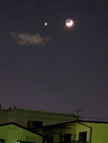 月の隣に金星が輝いています。西の空を見てみましょう。