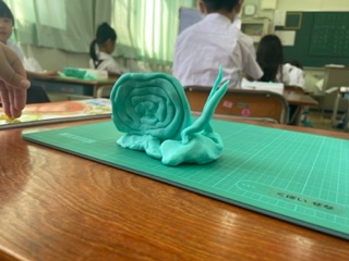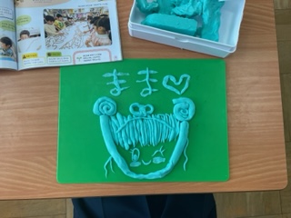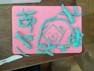 あぶらねんどを手で転がして、ひもひもねんどを作りました。ひもひもねんどを使って、作品を作りました。