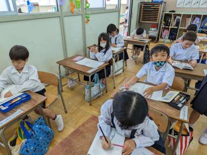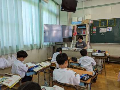 ひらがな「す」の指導をしています。ノートをモニターに写して、書き方のコツを伝えています。