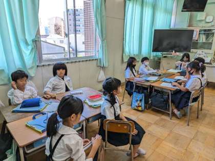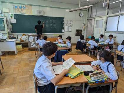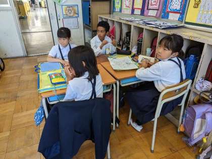 自分たちのまちの安全マップについて考えています。何を書き込めばいいのか、どこの色を変えればいいのか、みんなで考えましょう。