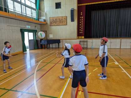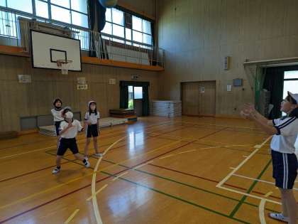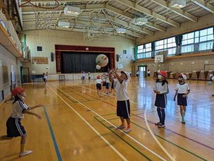 ネット型ボールゲームに向けて、受けたり、弾いたり、打ったり、いろいろなボール操作の練習をしています。チームで協力して、ルールを守って楽しくゲームしてほしいです。