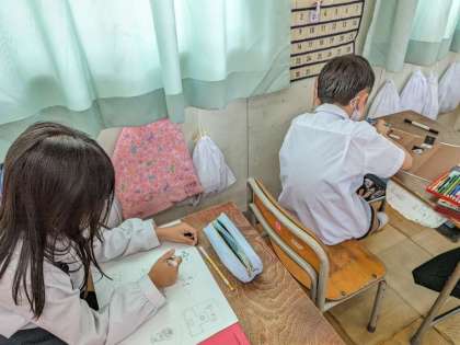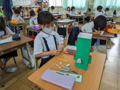 アートカッターを使って窓を切り取り、そこから見える面白い絵を楽しんでいます。2年生になって初めての立体作品です。