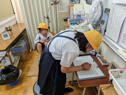 けがをしてしまったので、6年生が保健室まで付き添って、サポートしてくれています。6年生の優しさが嬉しいです。早くけがを治して、また一緒に遊ぼうね!ありがとう。