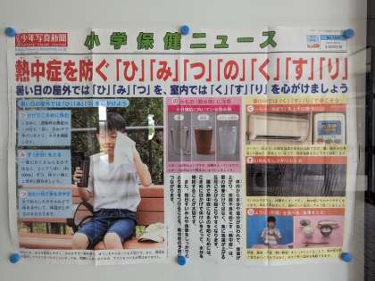 玄関の掲示板に、熱中症対策の合言葉を貼っています。