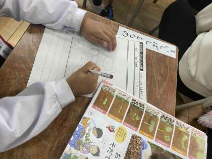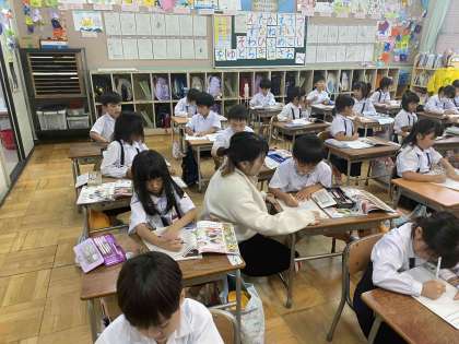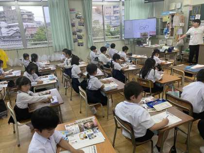 あさがおの葉をよく見ながらシートに書いています。今日は大雨で中庭にはいけませんてしたが、教科書でしっかり学習できました。