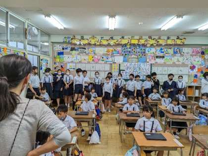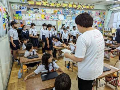 1年生のパソコンのログインを6年生がサポートしてくれています。たてわり班の6年生がとても頼りになる存在です。