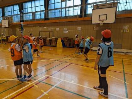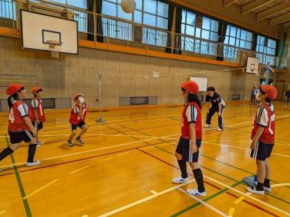 講堂でネット型ゲームに取り組んでいますソフトバレーボールに繋がる動きでラリーを楽しむことができていました。