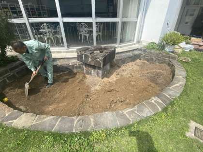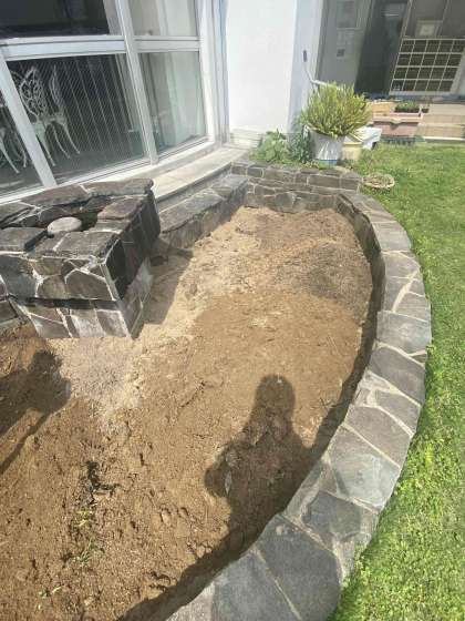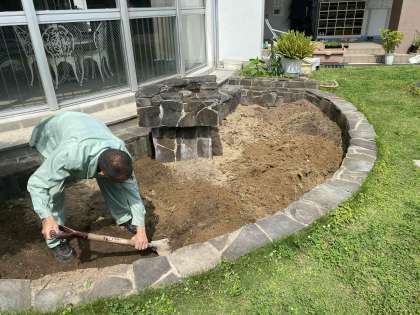 中庭にある池ですが、水漏れのため長年そのままの状態で放置されていましたが、今回、管理作業員の山田さんから「花壇にしましょう!」という提案があり、作業を行っています。かなり深い池だったので、相当な量の土を人力で運んできてあと一歩の所まできました。完成が楽しみです。