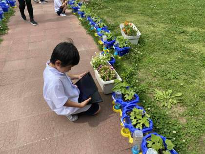 6年生に教えてもらったタブレットの操作ですが、早速起動してアサガオの撮影に行きました。慣れない手つきで大変ですが、上手に撮影できている子も多かったです。