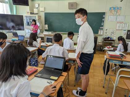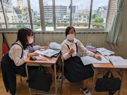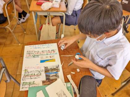 防災ポスターを作るための資料をパソコンを使って調べ、プリントアウトしています。効果的な資料をどんなふうに割り付けたらいいか考えています。