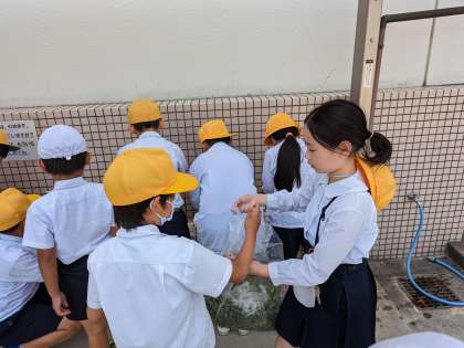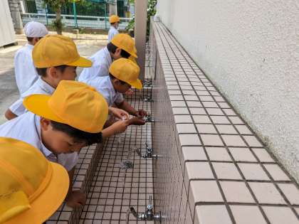学習園の雑草抜きを一生懸命頑張りました。指先に土が詰まったみたいで、みんなで指先をきれいに洗っています。