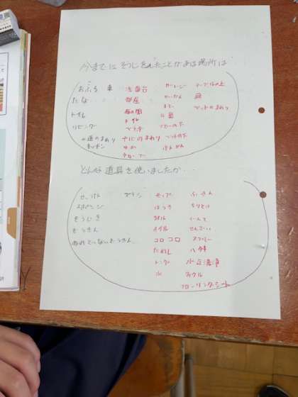 今日は、自分たちが学校以外で行っている掃除について書き出し学習を進めました。各自、今までの生活を振り返ると、お家の中や周り、習い事の稽古場など様々な場所を掃除していました。
