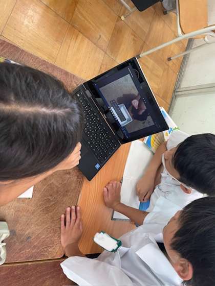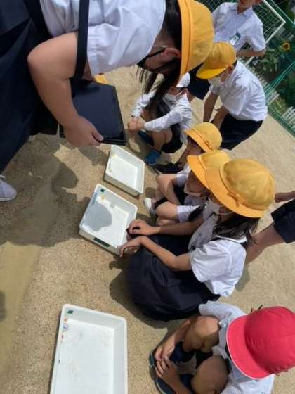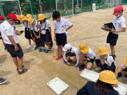 雨が降ったあとの運動場にできた溝を使った実験をしました。運動場にあった水はどのように流れていくのか、そして地面の傾きと関係があるのかを調べました。教室では、パソコンで撮ったものを見ながらノートにまとめました。