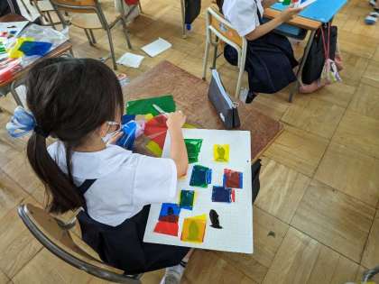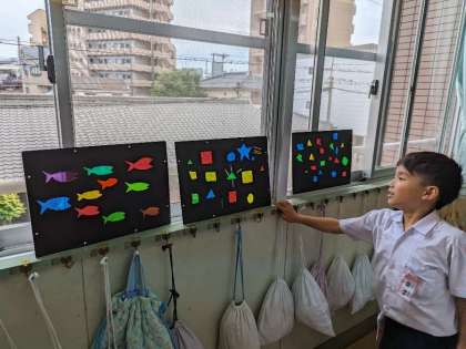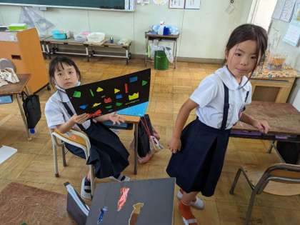 切り抜いたボール紙にカラーセロハンを貼り、とても綺麗な透き通った感覚を楽しむことができました。形がとっても面白い。