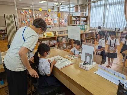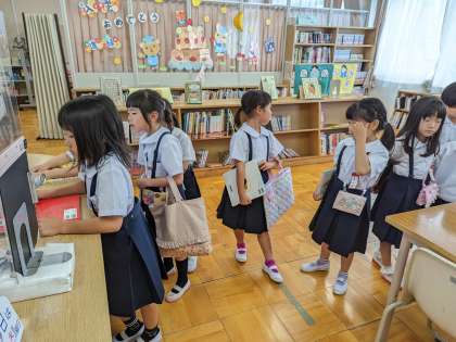 図書室に行く前に廊下に並ぶルールを確認しました。図書室ではかかりを仕事を一生懸命頑張っていました。○年○組○番借ります、返しますと言えるようになりました!