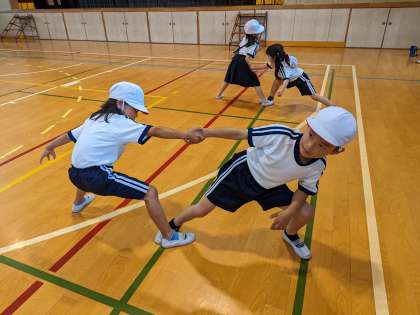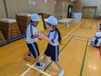 相手の重心を崩して、倒すことを目標にしています。力試しの運動です。安全に気をつけて活動することができました。