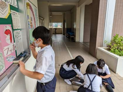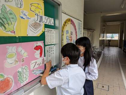 今日の献立について、給食委員会の子たちが朝からみんなに伝わるように準備をしています!