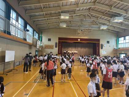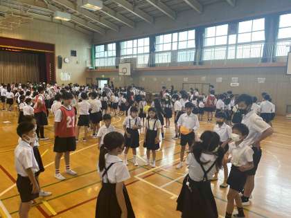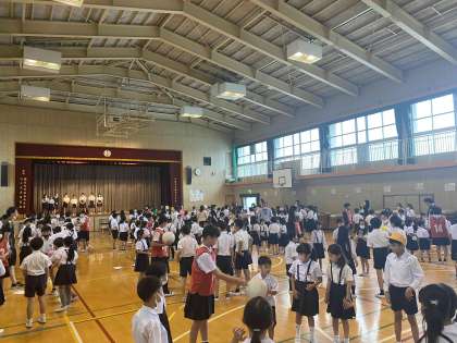 今日は講堂で児童集会がありました。音楽をかけながらのボール回しで、音楽が止まった時にボールを持っている児童がアウトとなります。たてわり班で楽しむことができました。