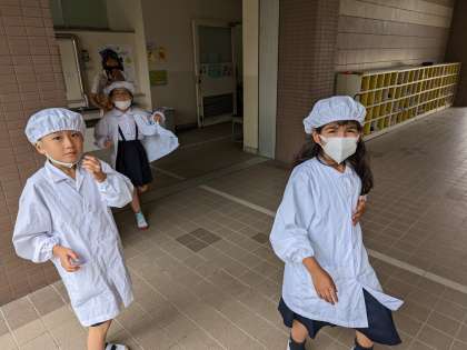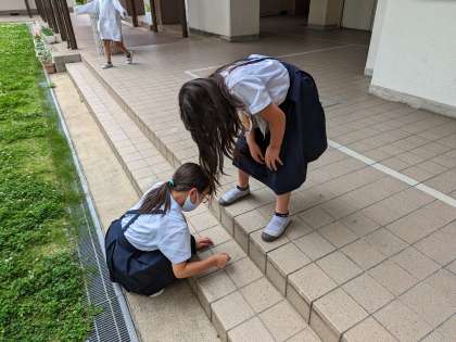 中庭に小さな虫を発見しました!知的好奇心のかたまりの2年生です!