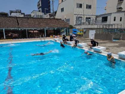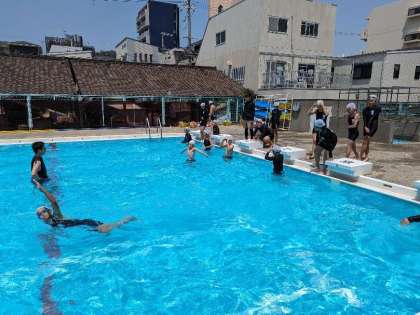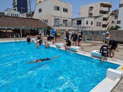25mを泳げるかどうか練習です。楽に速く泳げる方法を見つけていきましょう。足が沈むと水の抵抗が大きくなるため、前に進みにくくなります。頭を水の中に入れ、できるだけ下半身が水面あたりにあるようにすることで水の抵抗を受けにくくすることができます。練習中から意識してやってみましょう!