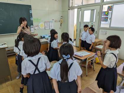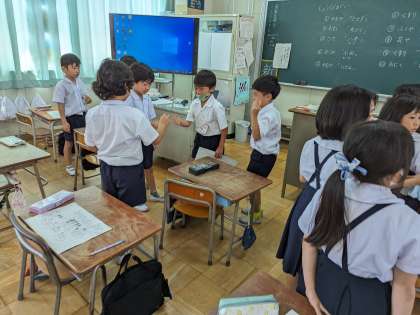 商店街を誰と一緒に行くのかグループぎめしています!友達と協力して頑張りましょう。