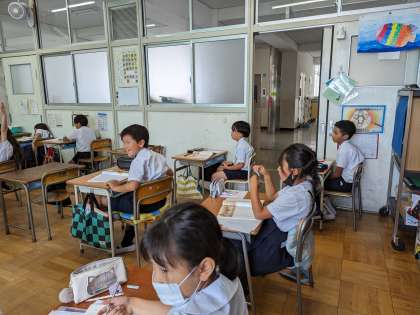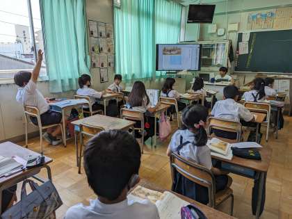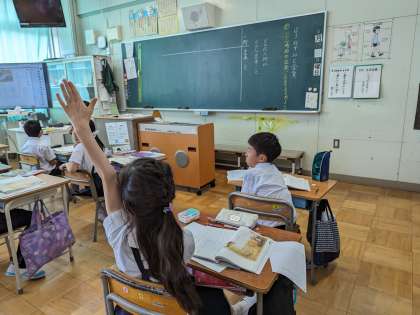はりねずみと金貨の1.2場面の出来事をまとめようという学習のめあてです。手を挙げるとき、ピント肘は伸びていますか?素晴らしい手の挙げ方、クラスの見本です!